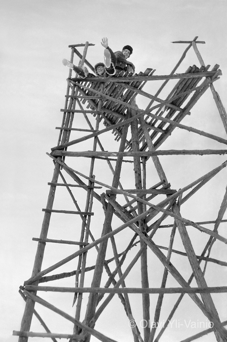 Oksivuoren kolmiomittaustornissa Martti Lahti ja Antti Mäki-Latvala. Kuvan oton jälkeen torni uusittiin vielä samana keväänä 1972 (toukokuu). Kuva Olavi Yli-Vainio su 2.4.1972.